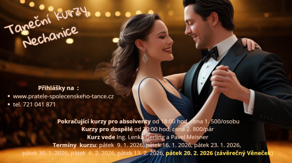 Kurzy budou probíhat každý pátek od 9.ledna 2026 v Kulturním domě v Nechanicích. Kurz bude ukončen závěrečným Věnečkem, který proběhne formou taneční party v pátek 20.2. 2026 od 20:00 hodin v multifunkčním domě ve Stračově. Kulturní dům v Nechanicích je bohužel plně obsazen, proto musíme zvolit náhradní řešení. Na závěrečný Věneček jsou zváni hosté, kamarádi, příbuzní a všichni, kteří se rádi baví.